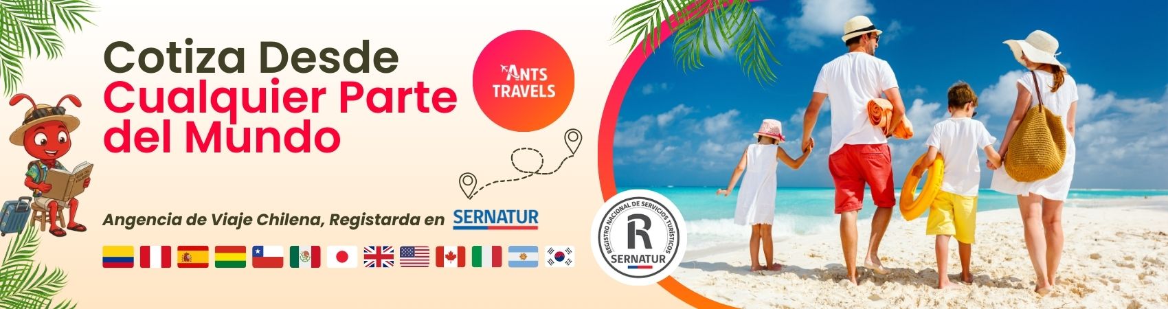 Viajar debería ser emocionante, no complicado. En Ants Travels te acompañamos en cada paso para que vivas la experiencia que siempre soñaste: destinos increíbles, precios justos y un servicio cercano que se adapta a ti. Estamos registrados en SERNATUR para que viajes con total seguridad y respaldo. Tu aventura empieza aquí… ¿A dónde nos vamos?